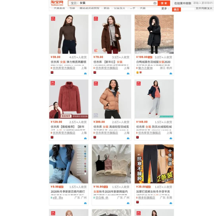 在淘宝,以女装为关键词进行搜索,然后按照销量排序,你会看到什么?铺天盖地袭来的是优衣库,以及一些白牌网络爆款。在单件月销量上千的女装中,偶尔能看见H&M、波司登、阿迪的身影。男装情况类似,只是南极人、俞兆林、山寨耐克、山寨阿玛尼的出现频次达到不容忽视的程度。拼多多由于群体不同,价位的差别很大,十元左右的服装销量动辄10万+。从品牌的角度说,拼多多是白牌、南极人、北极绒、俞兆林的天下。
