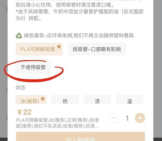 在喜茶外卖的吸管选项中,标明“绿色喜茶-应环保条例,我们不再主动提供塑料餐具”,选项则设置有“PLA可降解吸管(推荐)”“纸吸管-口感略有影响”“不使用吸管”三个选项。一名喜茶员工表示,“从目前我接手过的订单来看,选择PLA吸管的消费者远多于纸吸管。”