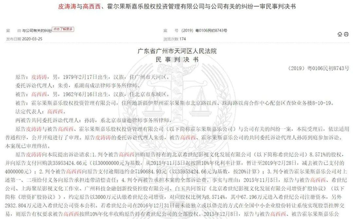 2015年11月,皮涛涛与北京希世纪、高希希等达成合作,约定皮涛涛以3000万元认缴北京希世纪增资,对应股权比例为8.5714%,希望北京希世纪能够在2016年12月31日之前完成新三板上市。但如果北京希世纪未能在规定时间内完成上市,皮涛涛有权要求高希希按照10%年化利率收购皮涛涛持有北京希世纪的全部股权。