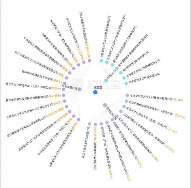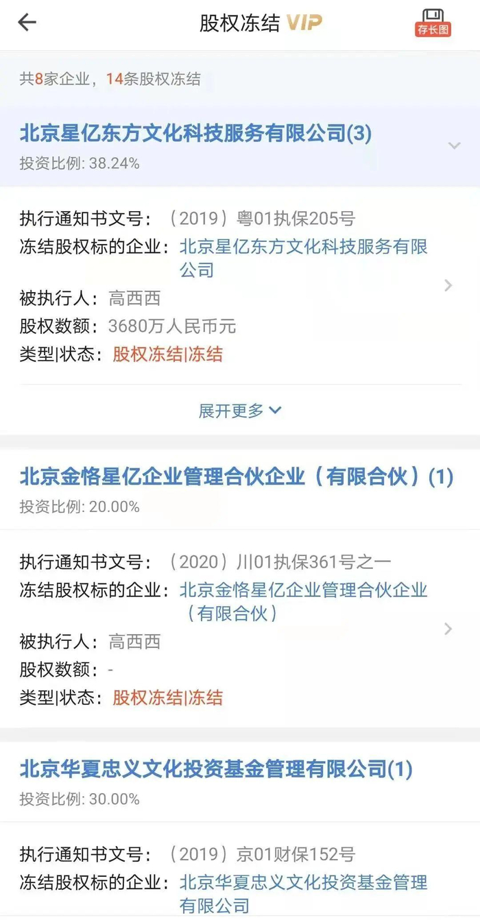 启信宝显示,截至目前,高希希在星亿东方、霍尔果斯恒兴影视、北京世希文化、北京星艺时尚等7家公司担任法定代表人,同时还在星亿东方、长城荣耀、华夏忠义文化等10家公司持有股权。值得注意的是,高希希名下这些公司,有8家被股权冻结,仅星亿东方一家公司就涉及3条股权冻结信息。