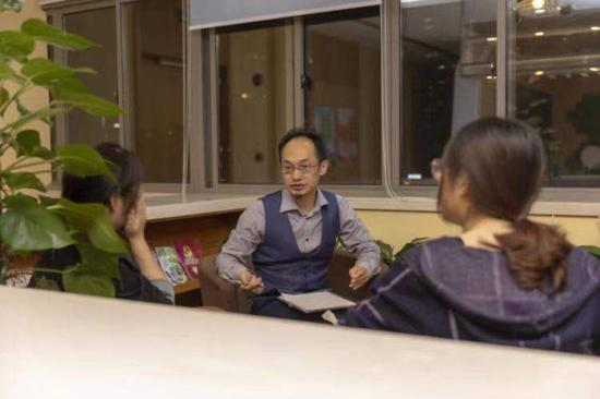朱身勇带记者参观了他的办公室。办公室里面有一面墙是书架,里面摆放着很多经济管理的书籍,其中,美国萨尔瓦多·米纽庆写的《家庭与家庭治疗》是他最喜欢看的书籍之一。他的办公室旁边还有很多直播的设备,包括2台补光灯。记者在他的一间咨询室坐下,这个房间里面有几张沙发椅子、靠枕和一些形状各异的绿色盆栽,顿时让人心情放松。