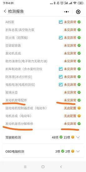 第一份报告显示,共检测的数十个项目中,仅有“变速箱机脚垫”等个别项目存在“更换拆卸”,其余结论均为“未见异常”。涉及发动机的项目,“发动机总成”“发动机舱电脑板”“发动机舱零配件”“涡轮增压系统”等均为“未见异常”;“发动机是否分解维修”更明确结论为“未见异常”。