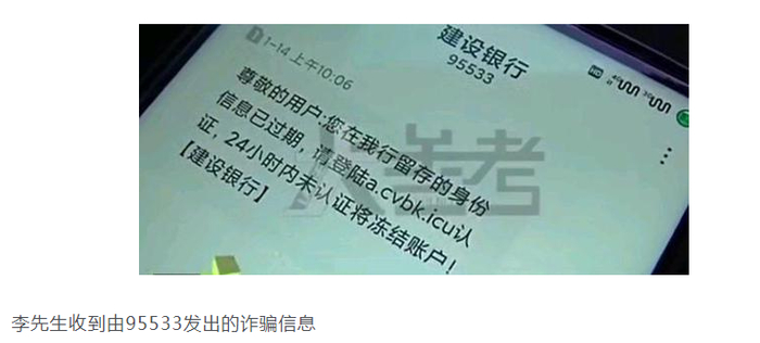 而李先生也是有着同样的遭遇,近日,河南郑州李先生收到一条由建设银行官方号码发给他的短信:尊敬的用户:你在我行留存的身份信息已过期,请登录a.cvbk.icu认证,24小时内未认证将冻结账户。