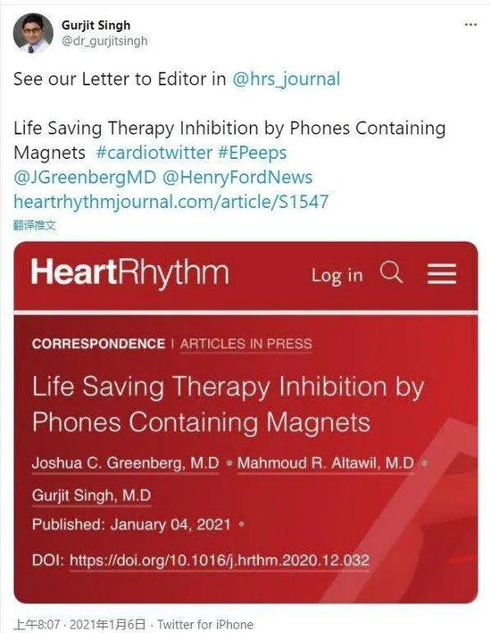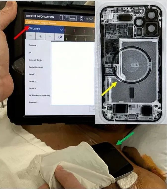 2021年1月,《Heart Rhythm》杂志发表了一项研究称,美国底特律亨利·福特心脏和血管研究所的三名医生经测试发现,将一部iPhone 12放在患者植入ICD(植入式心律转复除颤器)的左胸区后,ICD立即进入了“暂停”状态;把手机从患者胸前拿开后,除颤仪才恢复了正常功能。