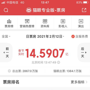 今年的中国电影春节档首日,当时间来到2021年2月12日下午1时47分,一个新记录产生了——中国电影单日票房达到14.59亿元!打破了2019年春节档首日票房14.58亿元的记录,这意味着今天从这一刻开始的每一分钟,都在创造中国电影史单日票房的新记录!