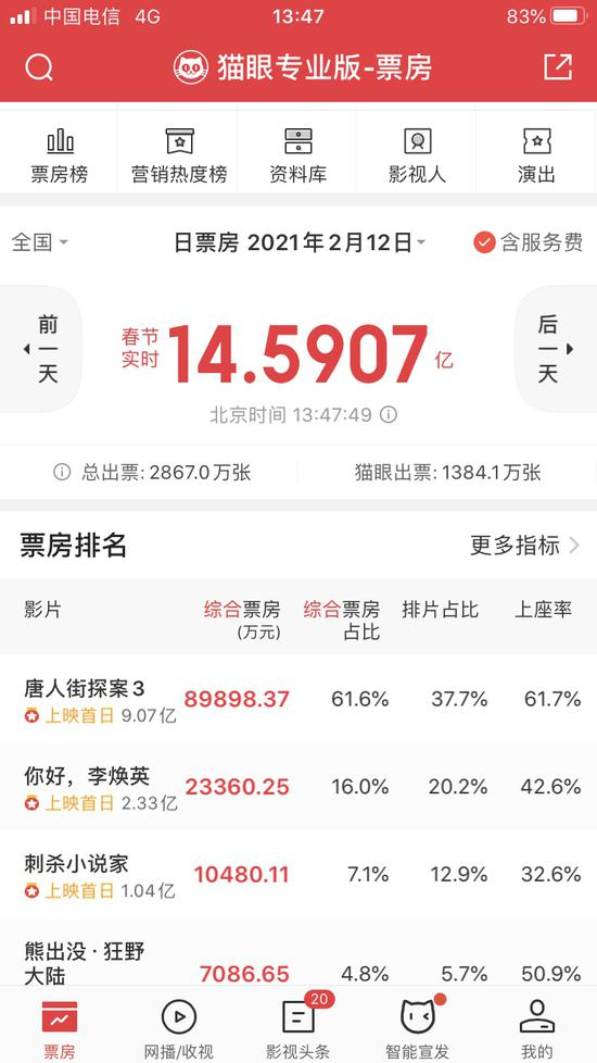 中国电影单日票房达到14.59亿元 刷新历史记录
