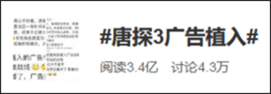 除此之外,《唐探3》的广告“又多又硬”成为吐槽的火力热点,关于《唐探3》广告植入的话题一路冲上了热搜,阅读3.4亿,讨论4.3万。