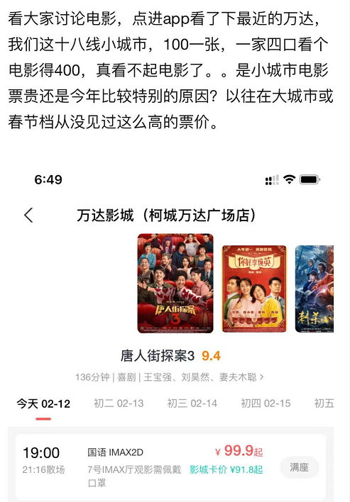 事实上,春节档的高票价已然“劝退”了不少人,不少人表示要等到节后再去观影。