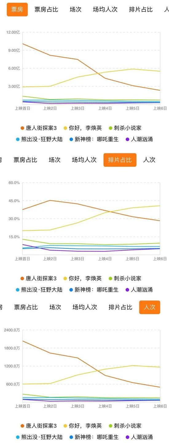 灯塔数据专业版显示,《唐探3》的日票房、拍片占比和观影人次在逐日下降,日票房从上映首日的10.09亿元逐日下降到了上映第六日的2.34亿元。而《你好,李焕英》的各项数据则一路走高,日票房从上映首日的一路攀升到了上映第六日的5.51亿元。
