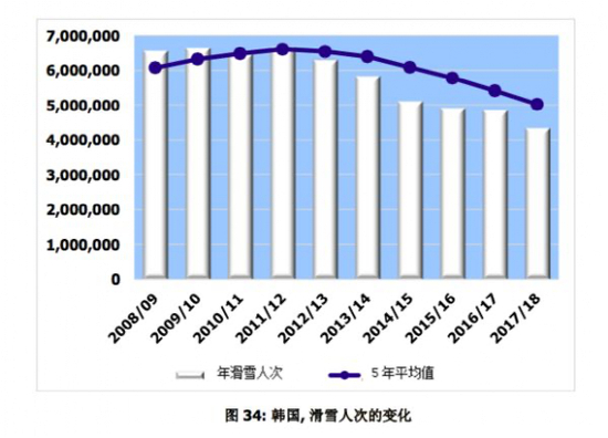 然而,2018年的韩国平昌冬奥会并没有达到预期效果,韩国的滑雪市场依旧萎靡不振。2017到2018年雪季的滑雪人次较前一年大跌10%,较五年平均水平下降20%。