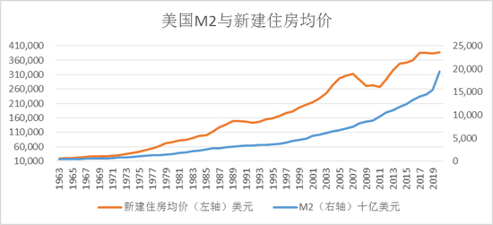 图4: 美国M2与新建住房销售均价之间的关系(1963-2020)