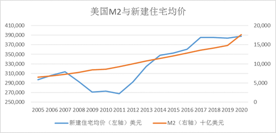 图6: 美国M2与新建住房销售均价之间的关系(2005-2020)