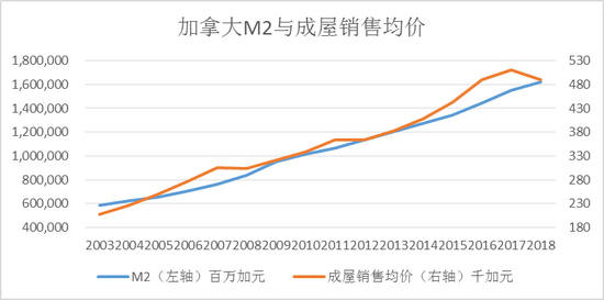 加拿大可获得的数据比较短。在16年的时间内,M2与成屋销售均价保持稳定关系。
