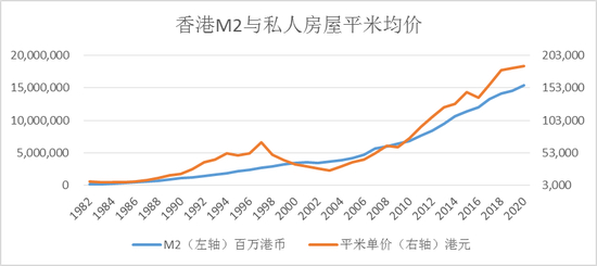 从图2看出,在长达38年的时间里,香港私人房屋每平米均价围绕M2上下波动,两者整体上保持了稳定关系。对数据做线性回归,结果显示,香港M2每增长约1亿港币,每平米均价增长1港币。