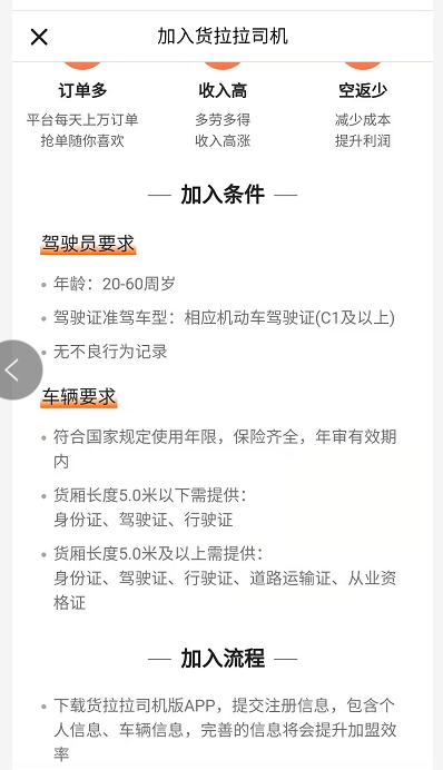 首先在平台司机的入驻审核上,货拉拉的APP上明确规定,成为司机所需的材料包括,具备C1及以上驾驶执照,具有1年驾龄以上,年龄20-60周岁,并且需要提供身份证、驾驶证、行驶证等相关证件信息等。但对司机的个人资质没有具体进一步的要求。