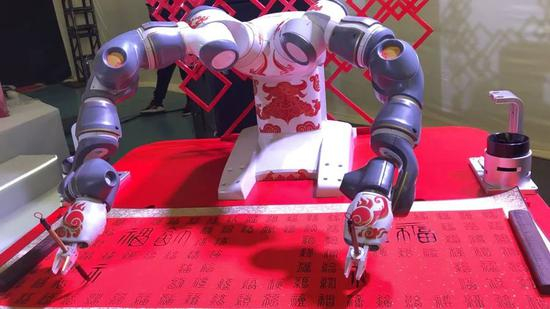 除了那群跳舞的“拓荒牛”四足机器人,还有就是现场挥墨的写字机器人!