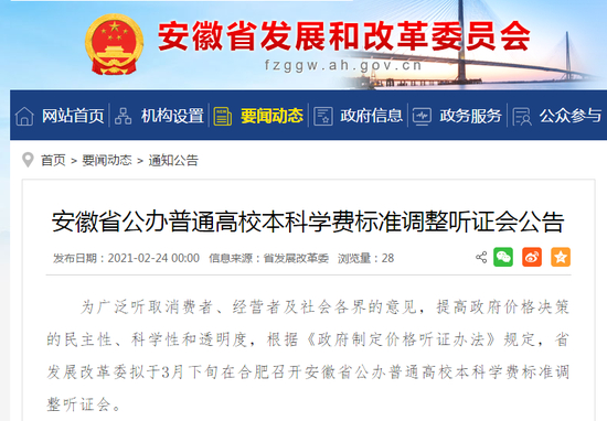 安徽省发展改革委发布公告显示