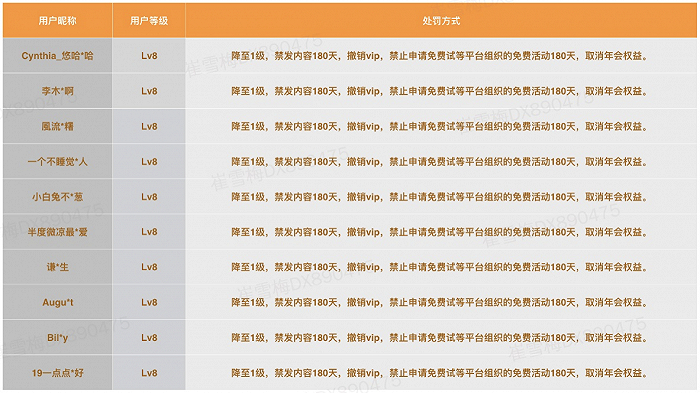 大众点评向记者提供的一份涉嫌参与刷单的大V处罚名单。