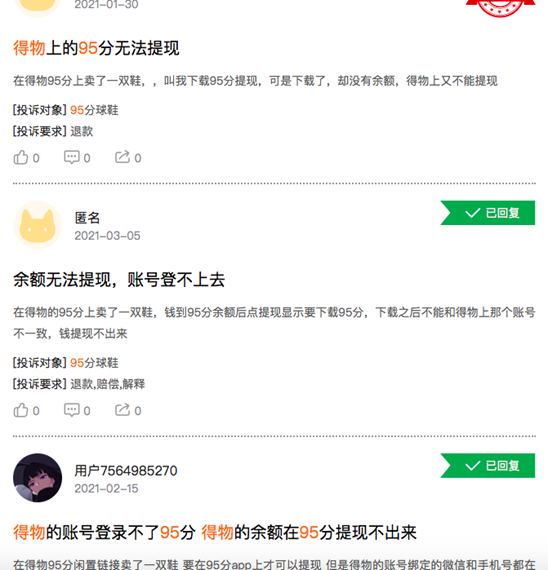 近日,多名卖家在黑猫平台投诉,称在得物电商平台卖出去鞋子,需要下载并登录二手电商App“95分球鞋”才能提取,但当下载该App后,显示新账户并无存款。