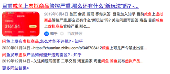 得知受骗的彭先生,曾在某搜索引擎搜索“闲鱼”和“虚拟商品”的关键词,发现搜索引擎上面充斥着“闲鱼卖虚拟商品日入300”字样的链接,一些经验贴,甚至详细介绍如何在闲鱼上架虚拟商品,如何虚拟上货。