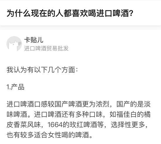 为什么国人喜欢喝国外啤酒?知乎上一条评论答道:口味多、显档次是购买主因,更重要的是主流啤酒价格较国产啤酒贵不足20个百分点,国人亦能接受。