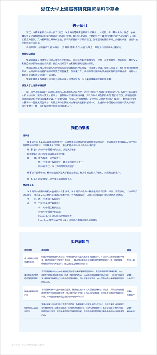 作为第一期资助,繁星公益基金将在未来3-5年向浙江大学教育基金会捐赠1亿美元,用于“计算+生物医疗”“计算+农业食品”和“先进计算”三个创新实验室的科学研究项目。