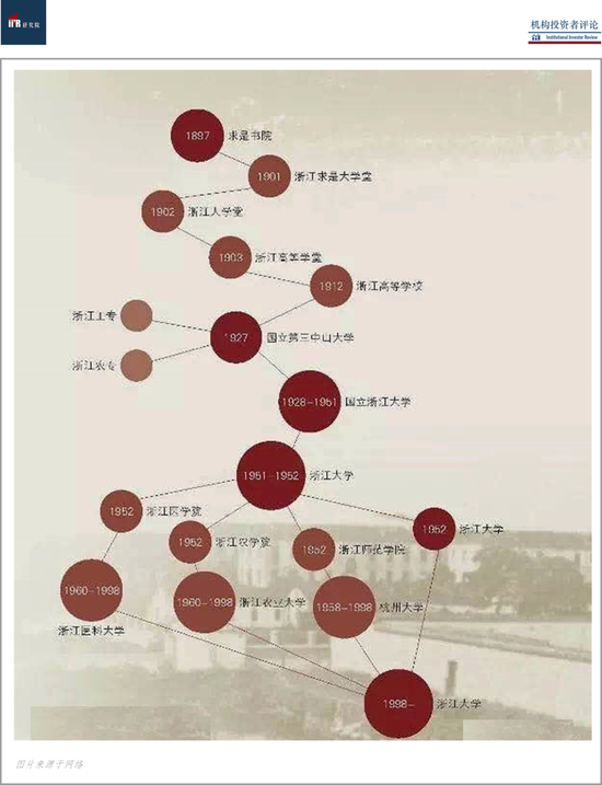 1897年(清德宗光绪二十三年四月二十日),浙大前身、效法西方学制的求是书院创立,这是中国近代史上最早效法西方学制创办的几所新式高等学堂之一。1928年,求是书院定名国立浙江大学。1937年,浙江大学开始西迁,1940年,开始在贵州持续办学,1946年秋回迁杭州。1952年,全国高等学校院系调整,浙江大学部分系科转入其他高校,留杭主体部分拆分、合并后发展为原浙江大学、杭州大学、浙江农业大学和浙江医科大学。1998年,四校合并,组建成新的浙江大学。