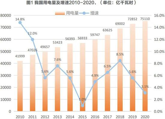 “十二五”期间,我国用电量增长14934亿千瓦时,年均用电量增速6.3%;“十三五”期间,用电量增长18177亿千瓦时,年均用电量增速5.7%。2020年受疫情影响,用电量增速仅3.1%。