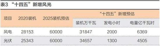 2020年12月的联合国气候雄心峰会上,习近平主席承诺,2030年我国风电、太阳能发电总装机容量将达到12亿千瓦以上。本文乐观考虑,假设2025年风光装机已达到12亿千瓦,风光各半,则“十四五”风电新增31847万千瓦,光伏新增34657万千瓦。风、光发电小时分别按2000、1300小时计,新增电量分别为:6369、4505亿千瓦时,合计10874亿千瓦时。