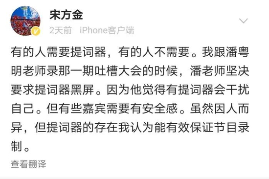 他们都谈到,提词器是为了保证节目的顺利录制,但并不是所有人都用,曾参加过《吐槽大会》的编剧宋方金说,一起录节目的演员潘粤明就坚决要求提词器黑屏,因为觉得有提词器会干扰自己。