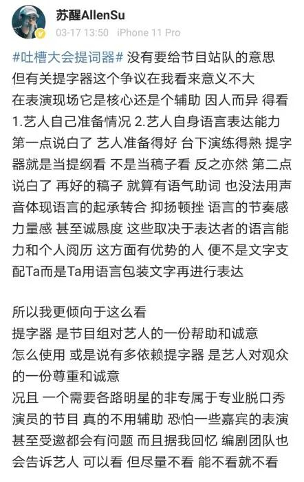 歌手苏醒也发文表示,提词器在表演现场是核心还是辅助要因人而异,一是看艺人的准备情况,二是看艺人的语言表达能力。他写道,一个需要各路非专业脱口秀演员的节目如果真的不用辅助,恐怕一些嘉宾的表演甚至受邀都有问题,而且编剧团队也会告诉艺人,可以看但尽量不看,能不看就不看。