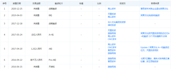 据天眼查显示,笑果文化已完成近7轮融资,融资金额超2亿元。投资方包括南山资本、天图投资、天图投资、游族网络、CMC资本等。