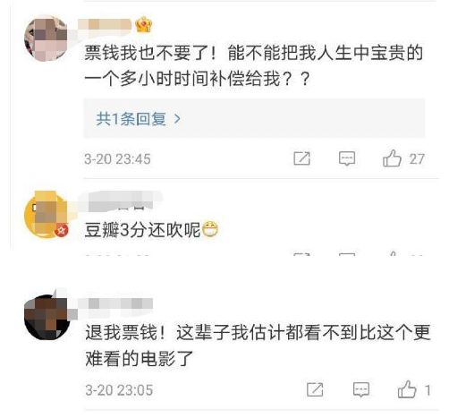 对此,有观众称,“对不起,我对你们的故事不感兴趣,电影票钱我也不要了,能不能把我人生中浪费的一个多小时还给我?”