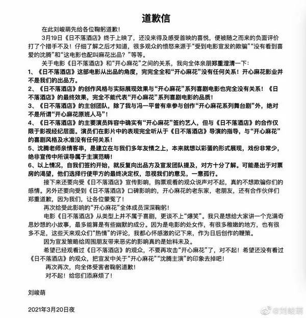 道歉信中称,虽然影片中有开心麻花的签约艺人,但与他们与《日不落酒店》的合作仅限于影视经纪层面,演员们在影片中的表现完全听从于《日不落酒店》导演的指导,与开心麻花的喜剧风格和水准没有任何关系。