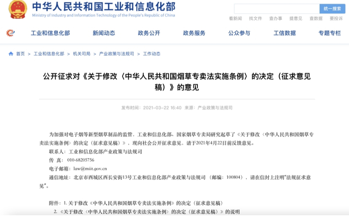 昨天(3月22日)下午,工业和信息化部、国家烟草专卖局针对烟草专卖法实施条例的修改,向社会公开征求意见。其中,拟增加的一个条款最受关注:“电子烟等新型烟草制品参照本条例中关于卷烟的有关规定执行。”