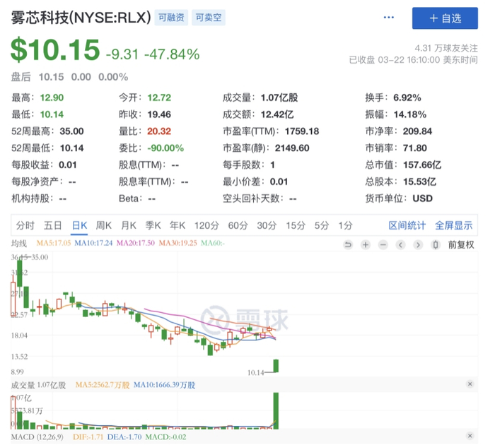 两个月前在美股上市的电子烟头部品牌——悦刻母公司雾芯科技,股价从前一天的19.46美元暴跌至10.15美元,跌幅47.84%。其市值目前不到160亿美元,一夜间蒸发144亿美元(约人民币940亿元)。