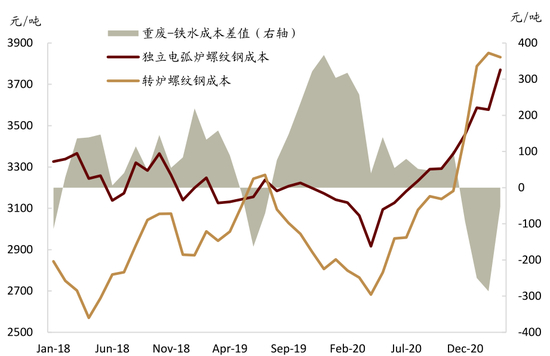 图表: 在重废-铁水差大于100元的情况下,独立电弧炉与转炉螺纹钢的成本才会出现逆转