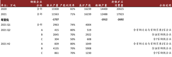 工信部已表态确保2021年粗钢产量将同比下降[2]。我们预计今年环保限产将实现常态化。唐山市已公布的限产方案中规定,今年剩下的三个季度(3月20日-12月31日),23家钢铁企业将被施以30%或50%的限产措施(按照产能利用率70%或50%计算)。我们粗略计算,全年唐山生铁产量将比去年减少1700多万吨,粗钢产量减少约1900万吨,折合成铁矿石需求则减少约2700万吨。