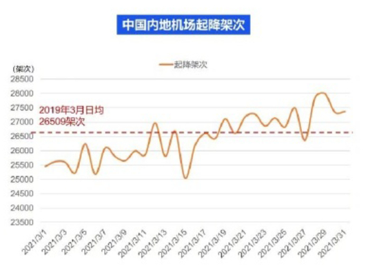 3月中国内地运输机场完成飞机起降约82万架次,环比提升69%,日均量接近接疫情之前2019年同期水平。