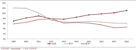 安踏、李宁、特步市占率变迁