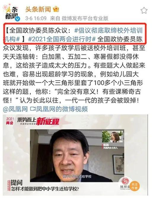 全国政协委员陈众议提出“彻底取缔校外培训机构”的建议。