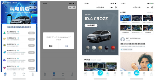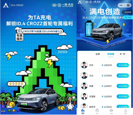 除了节目中的标版、中插、片尾鸣谢、花字、跑马灯等硬广以外,今年一汽-大众以“满电创造”小程序开始了饭圈打投的营销玩法。在小程序上,用户进行会员注册、签到以及邀请好友都会得到用来为创造营学员们“充电”的“电量”。一汽-大众则会为三期榜单的前三名提供相应的资源,包括《ELLEMEN睿士》杂志大片、全国九个城市户外广告曝光和决赛日腾讯视频的开屏广告。