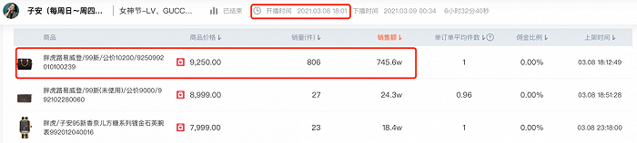 根据蝉妈妈的数据,今年3月1日至3月8日,子安一共开播7场,仅LV nano speedy一款包的累计销量就为3466件,累计销售额3206万,占总销售额的近60%。