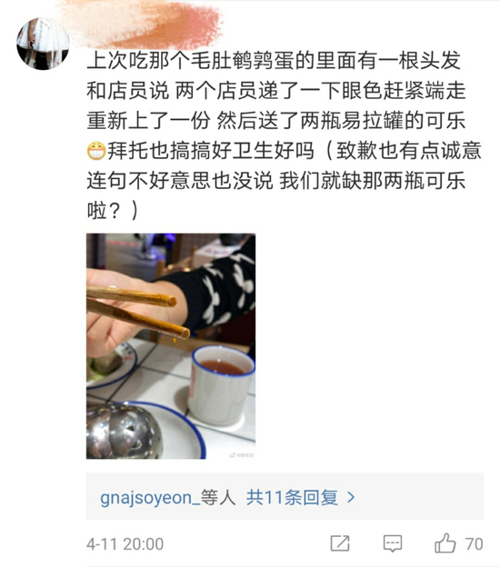 在陈赫转发道歉微博之后,便有网友在其微博下爆料称,曾在贤合庄火锅吃到过头发,但店员的处理方式只是“递了一下眼色,赶紧端走,重新上了一份”、“连句不好意思也没说”。对此,该网友表示“拜托也搞好卫生”。目前,该条评论还未得到官方回复。