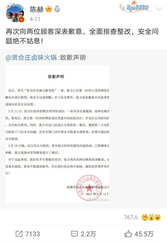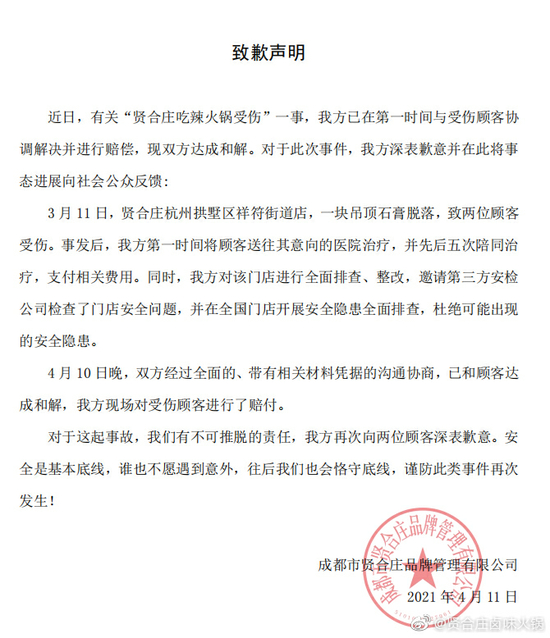 时隔一月后,福建省贤合庄餐饮投资管理有限公司微博发表《致歉声明》称,已在第一时间和受伤顾客协调解决并赔偿,现双方达成和解,并对门店进行全面排查、整改,邀请第三方安检公司检查了安全问题。