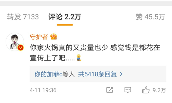 对此,有网友评论称“你家火锅真的又贵量也少,感觉钱是都花在宣传上了”,截至4月14日,该条评论已累计获得9.2万次点赞。