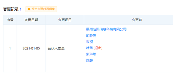 同时,天眼查还显示,叶一茜已于2021年1月5日退出福建贤合庄品牌管理合伙企业的股东行列。而新增的海南慕枫上东企业管理中心,最大股东则为李晨(持股比例99.99%)。