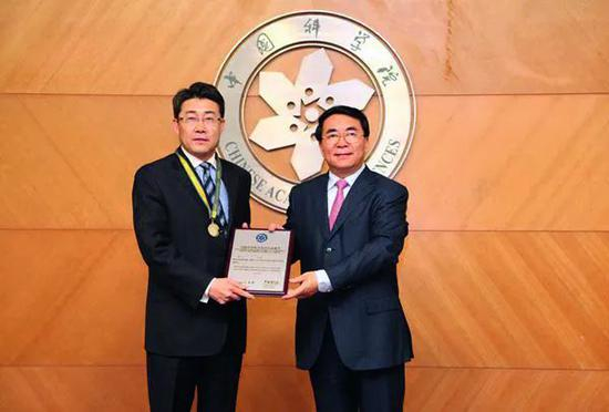 ·2015年1月29日,高福被授予2014年度中国科学院杰出科技成就奖(个人奖)。时任中国科学院院长白春礼(右)为他颁奖。