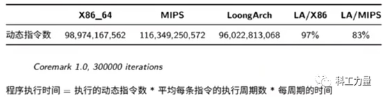 由于LoongArch指令设计上更加优化,在把源码编译为目标程序后的指令数量上甚至比x86略有优势。在Coremark的测试中,程序运行过程中执行的指令总数LoongArch为MIPS的83%,相当于运行效率提高了20%。在类型更加多样的测试中,综合测试结果,LoongArch平均比MIPS快12%,说明全新设计的LoongArch是成功的,可以为CPU带来大幅的性能提升。