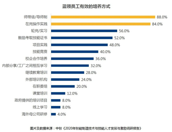 针对蓝领员工的培养方式,80%以上企业均认为,师带徒/导师制和在岗操作实践是有效培养方式,其次为轮岗/实习、鼓励考取技能证书、项目实践和技能竞赛。另有超三成企业认为校企合作培养、内部分享/工厂之间相互学习也是有效的培养方式。